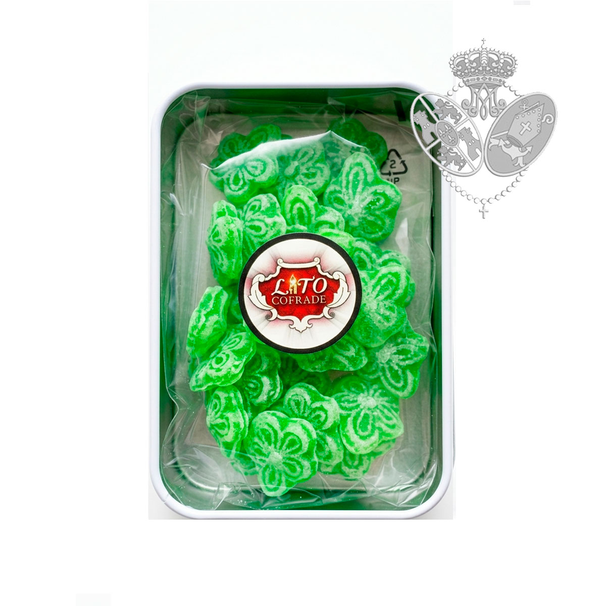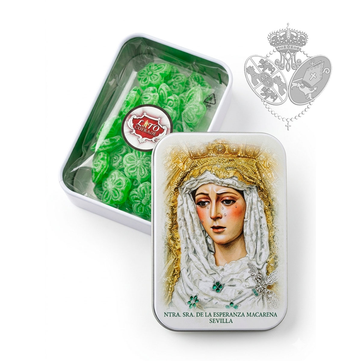 La tapa muestra una delicada imagen artística de la Santísima Virgen, acompañada de su característico color verde, símbolo de la Esperanza. En su interior, la caja incluye una bolsa de caramelos verdes en forma de mariquillas, un dulce guiño a uno de los símbolos más reconocibles de la Hermandad.