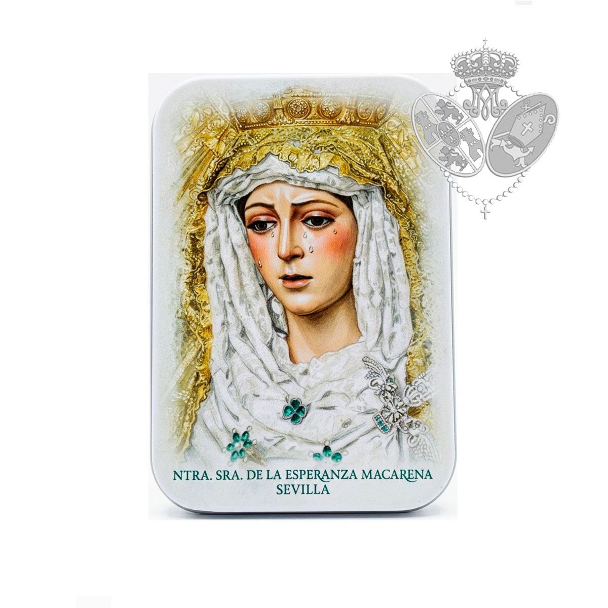 Presentamos esta cuidada caja metálica decorativa dedicada a Nuestra Señora de la Esperanza Macarena, diseñada como un recuerdo especial para devotos y amantes de la Hermandad.