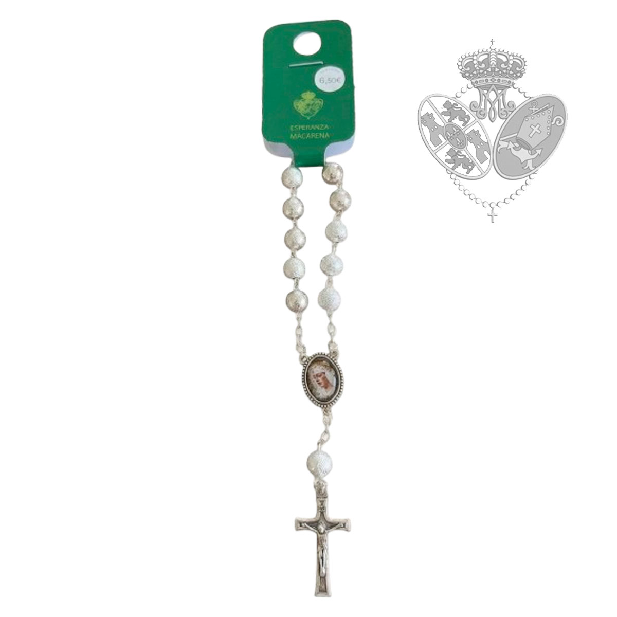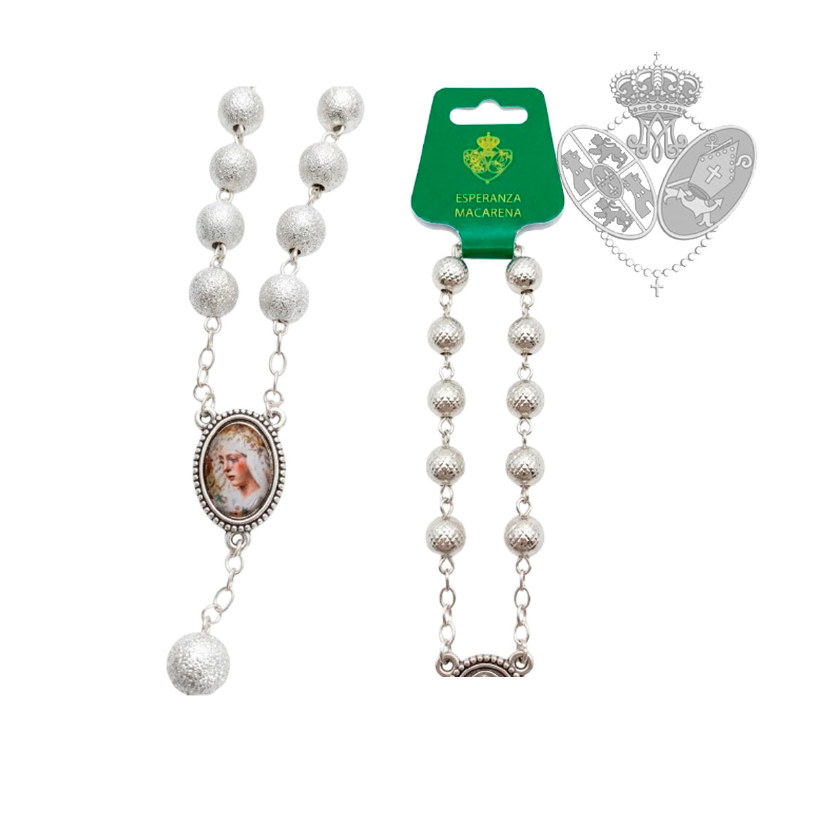 El decenario está compuesto por cuentas de acabado plateado que forman las diez Avemarías del rosario. En la pieza central aparece una medalla con la imagen de la Esperanza Macarena, uno de los símbolos de devoción más reconocidos de Sevilla.