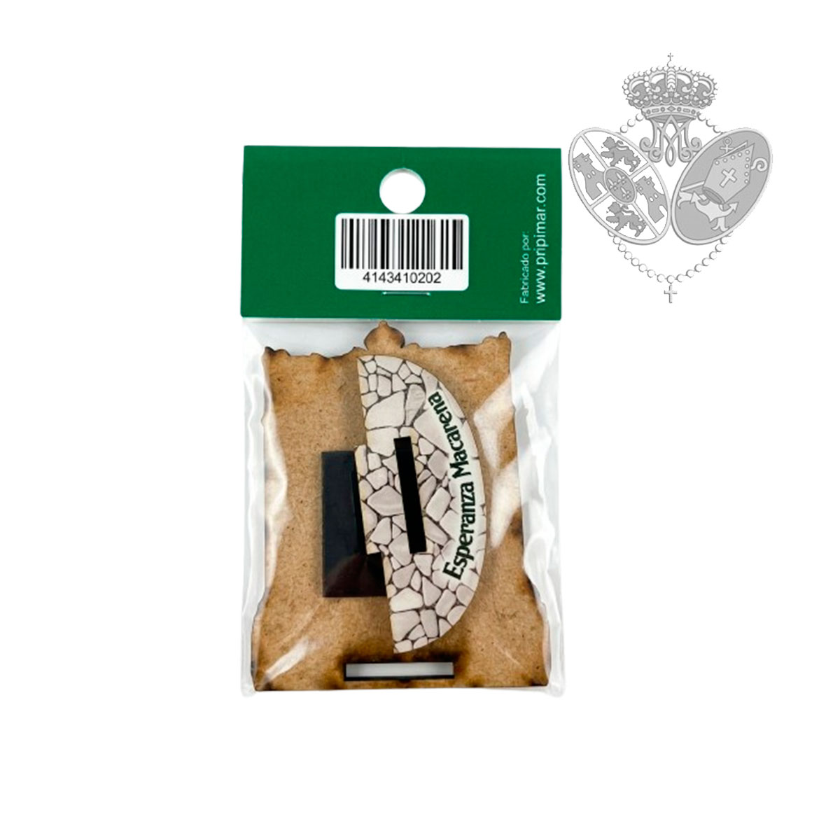 Imán cofrade de la Virgen de la Esperanza Macarena bajo su palio, realizado en madera tipo DM con impresión de alta calidad y gran nivel de detalle.