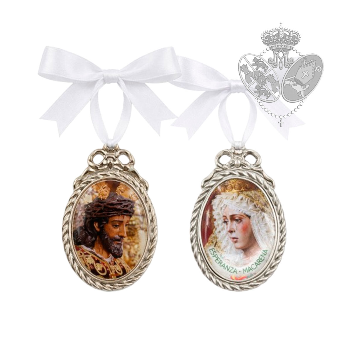Medallón de cuna a doble cara con imágenes de Nuestro Padre Jesús de la Sentencia y María Santísima de la Esperanza Macarena. Incluye elegante lazo blanco de raso para colgar en la cuna del bebé. Un detalle cofrade perfecto para recién nacidos y devotos macarenos.
