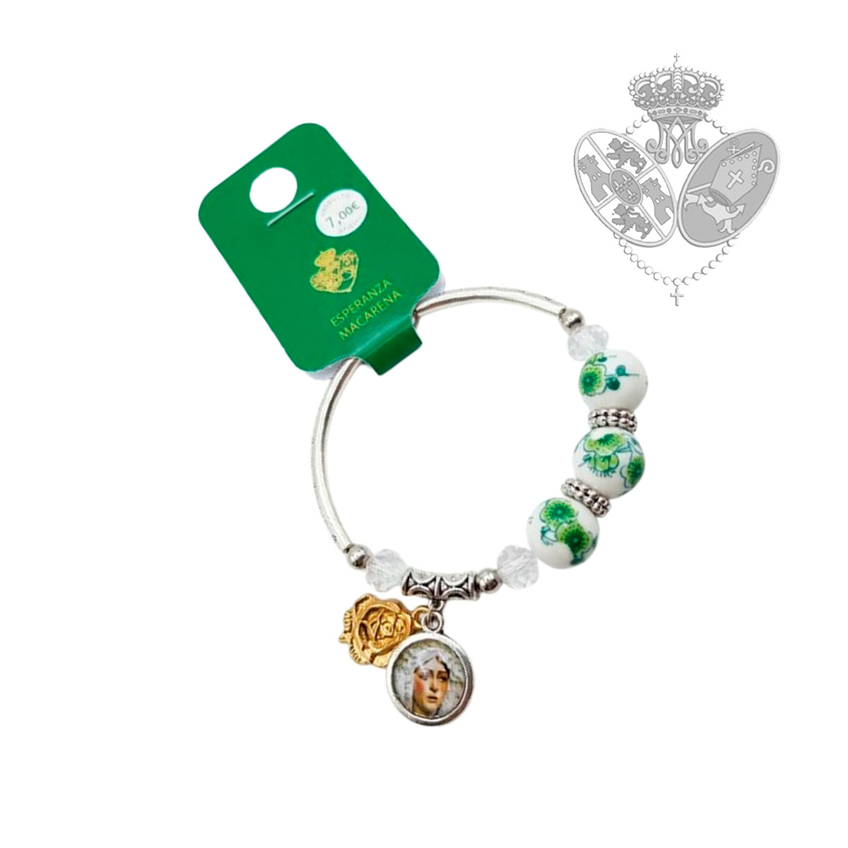 Esta pulsera de la Esperanza Macarena es un elegante complemento inspirado en la devoción a María Santísima de la Esperanza Macarena, una de las advocaciones marianas más queridas de Sevilla.
