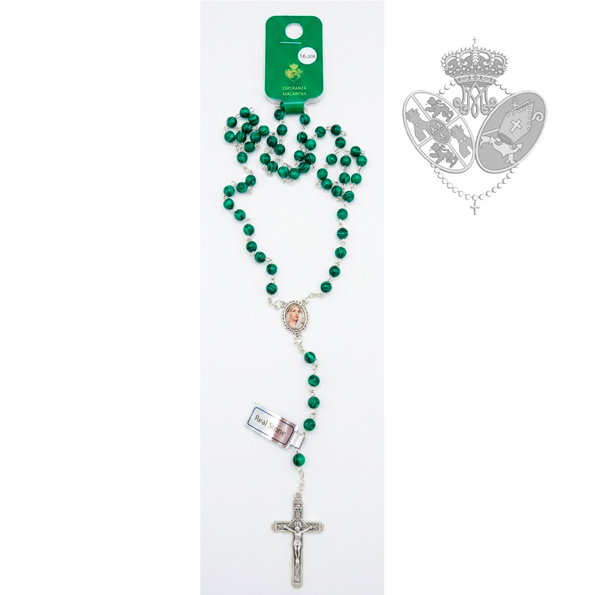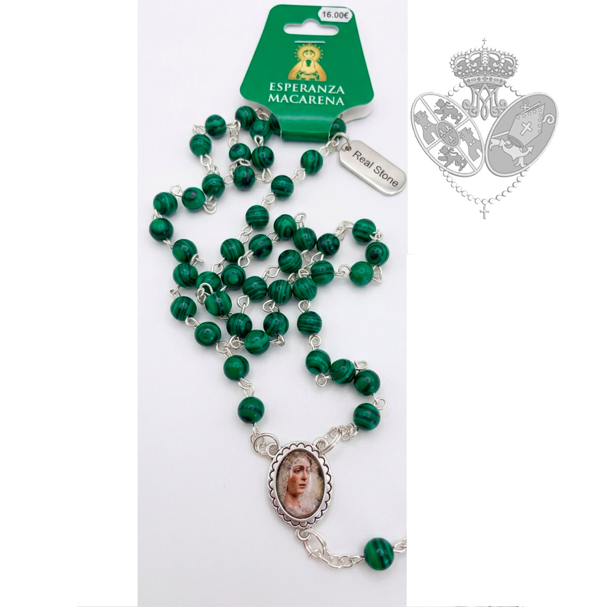 Este rosario con cuentas de malaquita verde con medalla de la Esperanza Macarena destaca por su elegancia y por la belleza natural de sus cuentas, elaboradas en malaquita, caracterizada por sus vetas verdes únicas.
