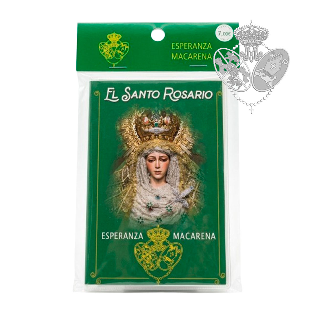 El estuche también contiene un rosario con cuentas en color verde, tono característico de la Esperanza Macarena, y una medalla central con la imagen de María Santísima de la Esperanza Macarena.