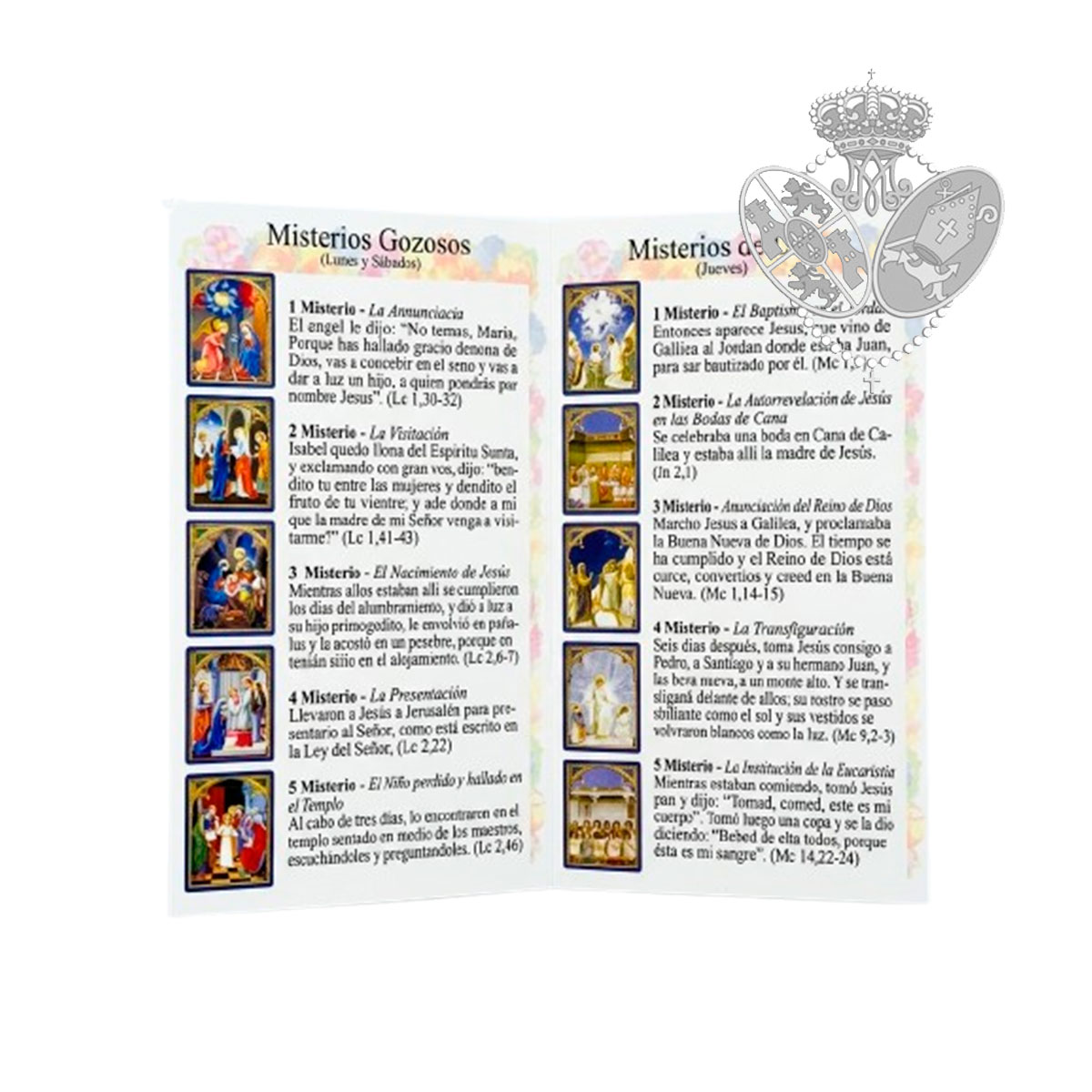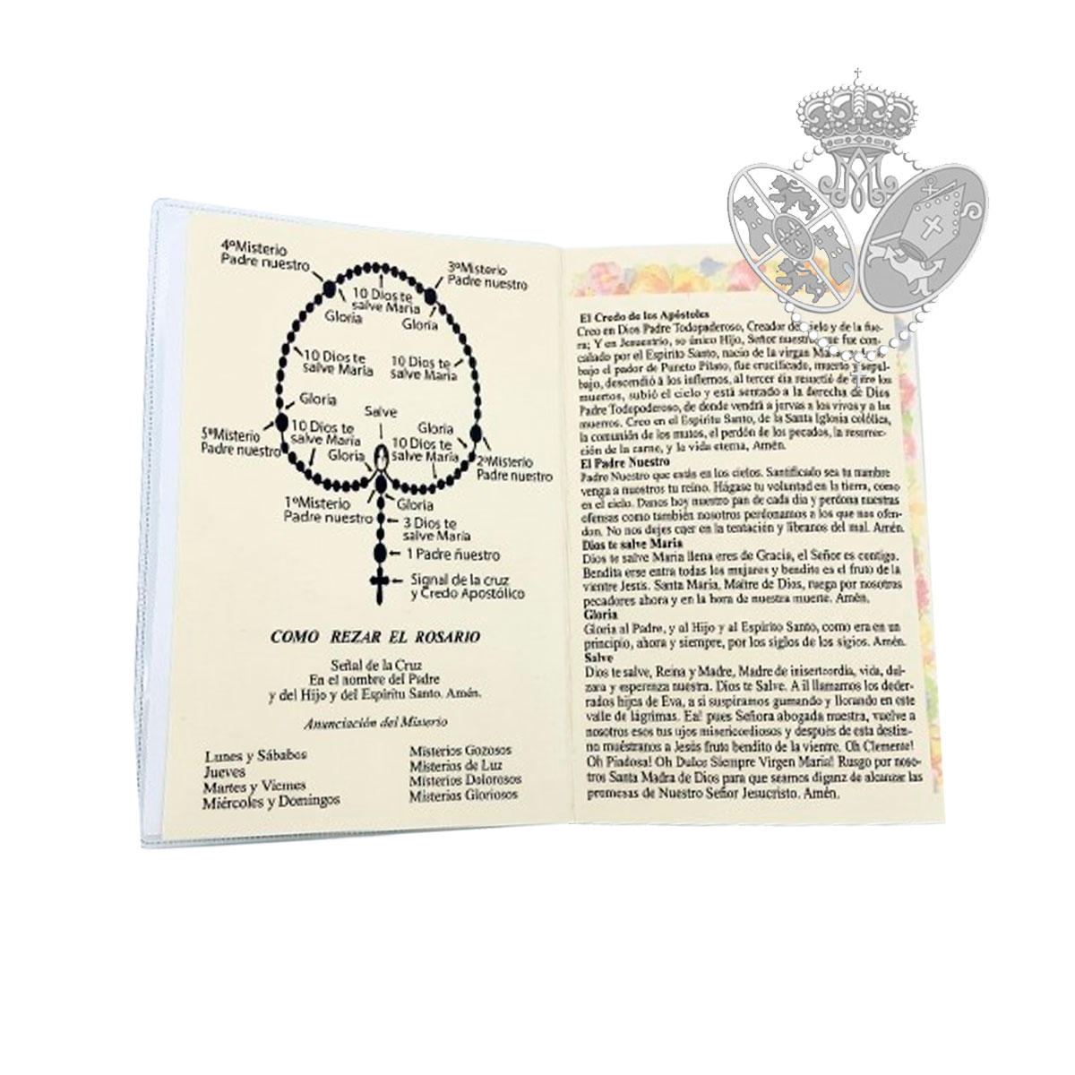 El conjunto incluye un libreto a todo color titulado El Santo Rosario, que explica de forma clara cómo rezarlo, incluyendo: